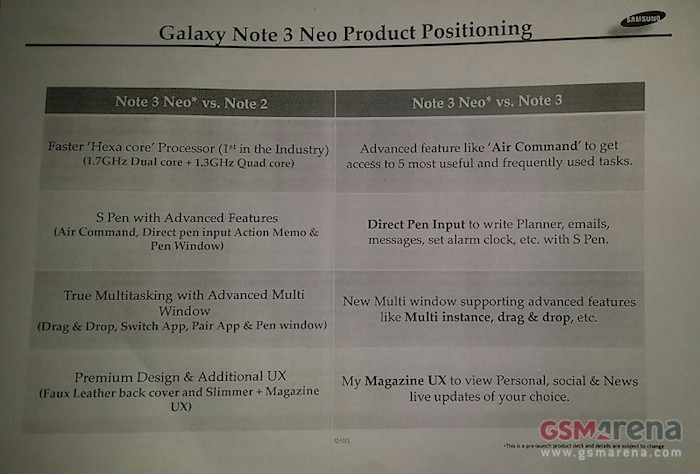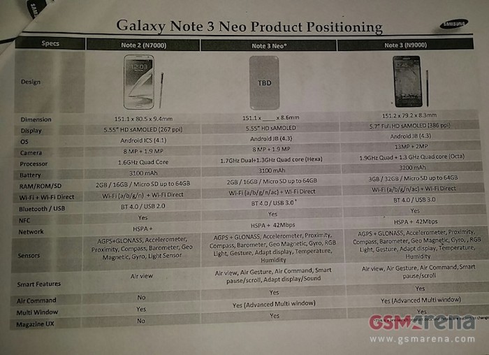 Mais, des documents en provenance de GSM Arena nous permettent d’en apprendre davantage sur le smartphone, puisque ces derniers suggèrent que le Note 3 Lite sera officiellement nommé le Samsung Galaxy Note 3 Neo. De plus, nous disposons de toutes ses spécifications. Concernant le processeur celui-ci serait un peu spécial car il arriverait avec une puce double-cœurs cadencée à 1.7 GHz, et une puce quadricœurs cadencée à 1.3 GHz. Même s’il n’y a aucun mot sur le sujet, il est douteux que les deux coeurs puissent fonctionner en même temps…
