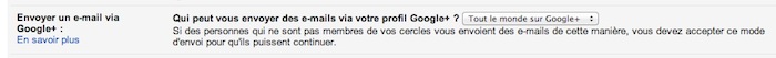 La nouvelle fonctionnalité est automatiquement configurée pour permettre de recevoir un e-mail de “tout le monde”, c’est-à-dire que les utilisateurs de Google+ qui ne veulent pas recevoir d’e-mails “d’étrangers” devront modifier le paramétrage natif. Pour ce faire, vous pourrez choisir de recevoir des e-mails via Google+ pour tout le monde, pour vos cercles étendus, vos cercles ou de personne.
