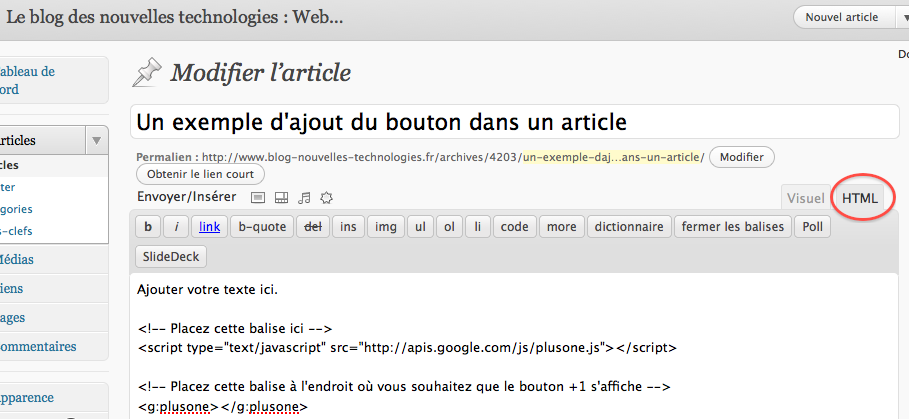 - 2 – Collez ce code depuis le volet HTML lors de l’édition de votre page ou de votre article. Vous pouvez également placer le code dans vos fichiers de thème où vous souhaitez qu’il apparaisse.