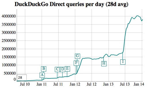 Mais, à quoi correspond réellement le massif pic de l’année 2013 ? Et bien, c’est tout simplement lorsque les détails du programme PRISM de la NSA ont éclaté aux yeux du grand public. Quasiment du jour au lendemain, DuckDuckGo a plus que doublé son trafic.