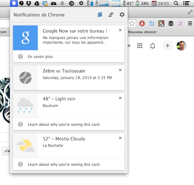 Bien sûr, vous aurez aussi besoin de vous connecter à votre compte Google au sein de Google Chrome Canary pour utiliser Now. Après avoir effectué ces étapes, vous devriez voir une icône de cloche dans votre zone de notification, et en cliquant sur celle-ci vous allez visualiser vos cartes disponibles.