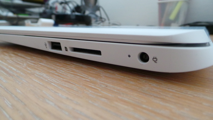 Les Chromebooks ont toujours été petits, dépouillés de connectiques, se concentrant uniquement sur le fait de vous donner accès au navigateur. Mais, sur le côté droit vous trouverez l’emplacement d’un port USB 2 et d’un lecteur de carte SD ainsi que le port pour l’alimentation. Le bloc d’alimentation est un peu grossier à mon goût, mais étant donné que vous pouvez facilement vous en passer au moins pour une journée, ce ne sera peut-être pas un problème pour la majorité d’entre vous.