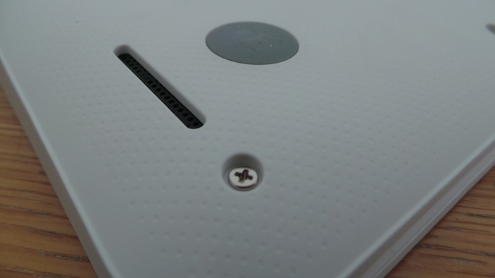 Sur le dessous de l’appareil, vous allez retrouver des ouvertures dédiées à la ventilation, ainsi que deux haut-parleurs.