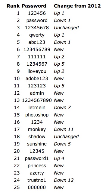Ouais, je ne plaisante pas. Mais devinez quoi ? Il y a des indications que les gens sont encore plus paresseux quand il s’agit de choisir des mots de passe. Sur ce que Slain mentionne, “un autre aspect intéressant de la liste de cette année, c’est que les mots de passe numériques plus courts ont commencé à apparaître même si les sites commencent à appliquer des politiques de mot de passe plus forts”. Certains nouveaux arrivants à la liste que SplashData a compilé sur les mots de passe de l’année 2013 sont sont “1234”, “12345”, et “000000”.