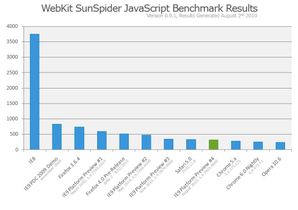 Une autre caractéristique unique à IE9 bêta est le nouveau moteur JavaScript : “Chakra”. Microsoft explique que ce moteur sera intégré à IE lui-même, au lieu d’être en dehors du navigateur. Il en résulte des améliorations de performances significatives par rapport à son prédécesseur et aide même à mettre IE9 de plus en plus à égalité avec ses concurrents en termes de benchmarking JavaScript.