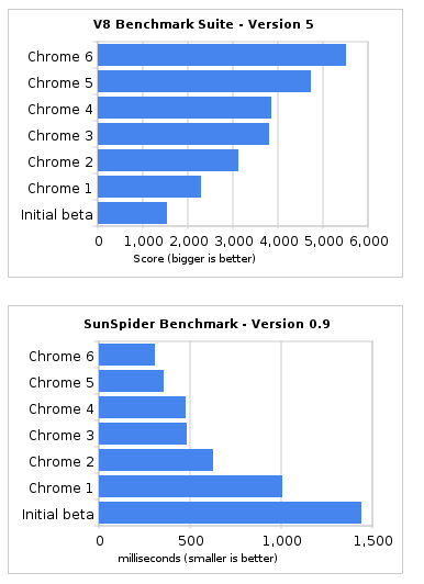 Une amélioration du moteur Javascript (V8) permet à la version bêta d’être 15% plus rapide que la version stable actuelle selon le benchmark SunSpide annoncé par Google. Selon cette étude, Google Chrome est 64% plus rapide que la référence Dromaeo DOM de Mozilla, permettant de déterminer la performance du navigateur.