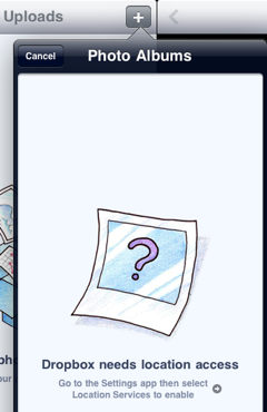 Je laisse régulièrement allumé sur toutes les applications de mes appareils mobiles (téléphone, tablette), que ce soit sur un système Android ou iOS, la géolocalisation. Cependant, je l’ai désactivé sur l’iPad, sûrement pour un test, et j’ai négligé de le rallumer avant d’essayer de copier une capture d’écran sur mon compte Dropbox pour une utilisation ultérieure. Comme vous pouvez le voir ci-dessous, j’ai reçu un avertissement :