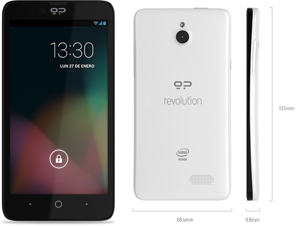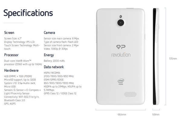 En ce qui concerne les spécifications, le Revolution ne jouera pas dans la cour des grands, mais ce n’est pas exactement ce qu’on lui demande non plus. Le smartphone embarquera un processeur double-coeurs Intel Atom Z2560 cadencé à 1,6 GHz, couplé à 1 Go de mémoire vive. Parmi les autres caractéristiques, on va retrouver un écran IPS de 4,7 pouces offrant une résolution de 960 × 540 pixels, 4 Go de mémoire interne extensible par micro SD, une caméra de 8 mégapixels sur la coque arrière, d’une caméra frontale de 2 mégapixels, la connectivité HSPA+, du Bluetooth, et le tout avec une batterie de 2000 mAh.