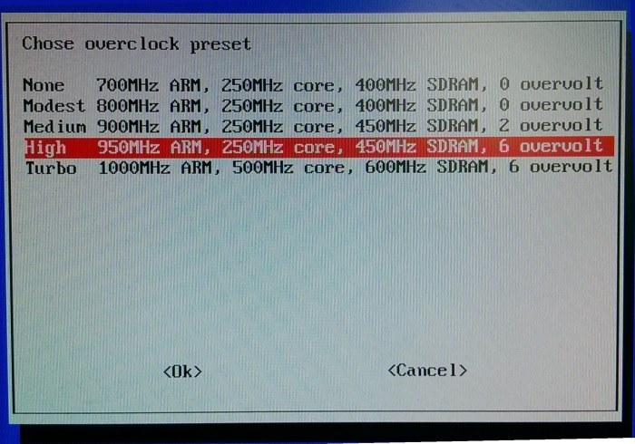 Sélectionnez “Overclock” et appuyez sur la touche Entrée. Appuyez de nouveau sur Entrée pour confirmer que vous comprenez les possibles problèmes avec l’overclocking. raspi-config offre cinq fréquence d’horloge : 700 MHz (pas d’overclocking), 800 MHz (modeste), 900 MHz (moyen), 950 MHz (haut) et 1000 MHz (turbo). Utilisez les touches fléchées haut et bas pour sélectionner la fréquence désirée et appuyez sur Entrée. Appuyez de nouveau sur Entrée lorsque la boîte de dialogue de confirmation apparaît.