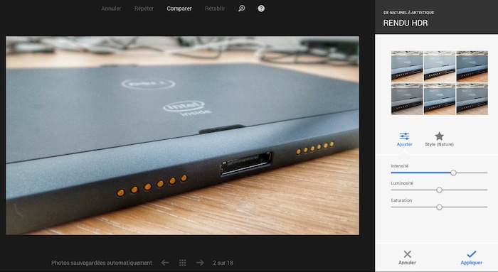 Le Googler André Meyer a annoncé les nouvelles fonctionnalités dans une publication Google+. La première est le mode HDR Scape, déjà disponible dans l’application mobile Snapseed de Google, qui vous permet de faire défiler un choix d’effets dynamiques de haut de gamme en cliquant sur les vignettes affichées sur l’écran. Vous pouvez régler l’intensité du filtre, la luminosité et la saturation de l’effet à l’aide des curseurs en dessous. Autrement dit, vous allez être capable de sublimer n’importe quel cliché en deux temps trois mouvements.
