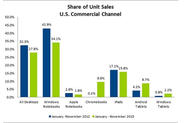 Le cabinet d’études NPD a publié un rapport à la fin du mois de décembre indiquant que les Chromebooks ont constitué 21% des parts de marché pour les ordinateurs portables en 2013 – et 9,6% du marché des PC en général. Ces chiffres ont surpris tout le monde. Bien sûr, quelques nouveaux modèles sont arrivés sur le marché, mais ils ont reçu peu d’éloge.