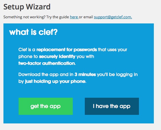 Installez le plug-in WordPress Clef pour votre site. Une fois activé, allez à la page des paramètres de Clef et cliquez sur le bouton “I have the app”.