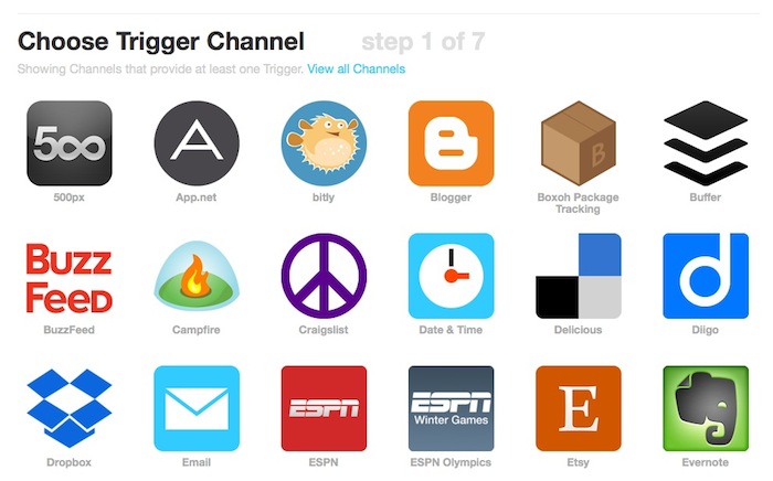 3. Avec les divers canaux présentés à l’écran, choisissez celui qui vous intéresse le plus, qu’il s’agisse d’un service ou d’un réseau social, afin de commencer votre recette. C’est le canal qui va provoquer une action à se produire. Par exemple, si vous voulez envoyer un e-mail d’une photo chaque fois qu’un nouveau cliché est téléversé dans Dropbox, alors Dropbox sera le déclencheur.