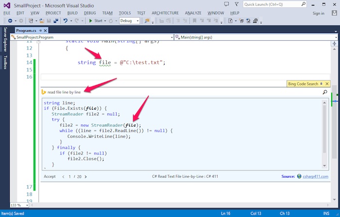 Bing dit que Code Search est capable de trouver des exemples de code pertinents à partir des dépôts, tels que MSDN, StackOverflow, Donnetperls et CSharp411. Voici comment cela fonctionne : Bing utilise des signaux et des métadonnées, y compris le type de projet et le contexte sémantique (compilateur C#/VB par exemple) combiné à un vaste index fournissant des exemples de code concernés directement dans l’expérience de Visual Studio. En quelques clics, vous disposez d’un ensemble d’extraits de code dans l’éditeur de Visual Studio.