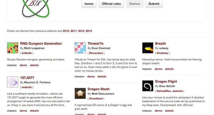 Bien que ce concours a commencé comme étant une blague en 2010, il a attiré tant de personnes qualifiées et talentueuses, qu’il est devenu un incontournable des concours 2014, dont entre en compétition tous les développeurs Web qui ont envie de surpasser, en acceptant le défi de coder une démo impressionnante JavaScript en 1024 octets ou moins.. Le thème de la sixième édition est “Here be Dragons”.