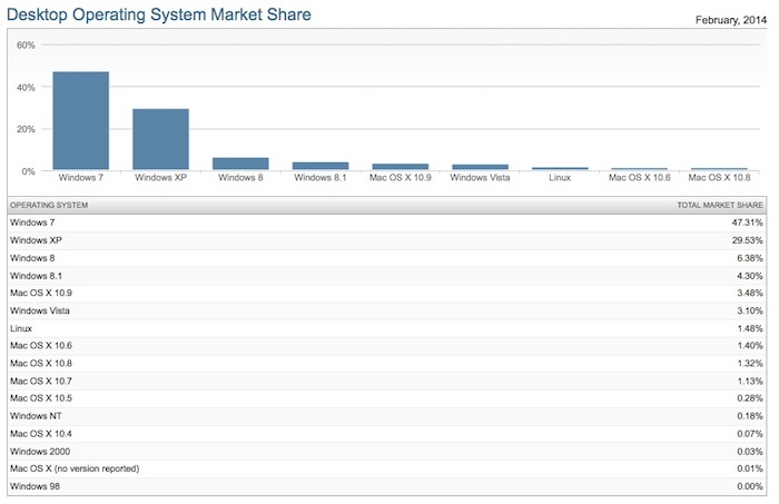 Après une baisse enregistrée, passant de 31,22% en novembre à 28.98% en décembre, la part de Windows XP est passée à 29,23% en janvier, et a légèrement été à la hausse à nouveau le mois dernier avec 29,53%. Bien qu’il ne s’agisse que d’une légère hausse de 0,3%, le fait que plus de gens optent pour utiliser un système d’exploitation qui a plus de 12 ans en dit long sur Windows 8.1.