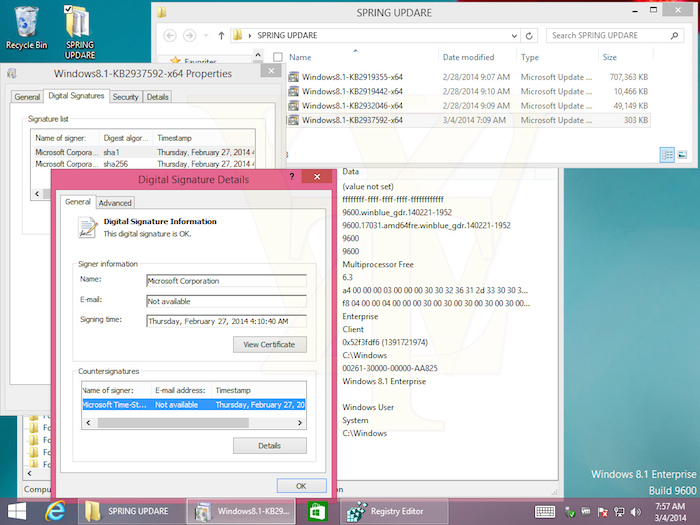 Les captures d’écran révélant la version RTM de Windows 8.1 proviennent du site russe Wzor. Selon ce dernier, la version est numérotée 9600.17031.WINBLUE_GDR.140221-1952, et elle a été compilée le 21 février dernier. Les captures d’écran ne semblent pas confirmer les nouveaux détails, autres que ceux du programme d’installation de la mise à jour – la mise à jour sera d’environ 800 Mo, et elle est nommée “Feature Pack” plutôt que plus traditionnellement “Service Pack”.