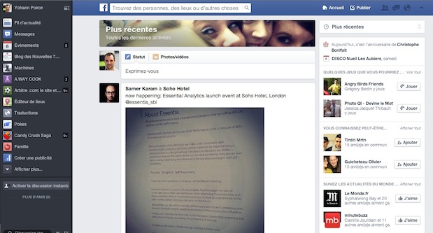Vous vous rappelez qu’il y a exactement un an, Facebook a dévoilé une nouvelle version de son News Feed dont le fondateur Mark Zuckerberg l’a décrite comme un “journal personnalisé”. Ainsi, les photos et les vidéos ont été mises en avant sur le réseau, alors que les diverses publications ont été séparées en ce que l’on pourrait nommer comme étant des “cartes” – un terme qui est aujourd’hui très à la mode avec la conception de Google Nows poussée dans les nombreux services et applications de Google, ainsi qu’un encadré sur la gauche offrant notamment des informations sur vos évènements à venir, ainsi que les anniversaires à souhaiter, et bien évidemment les recommandations du géant social.