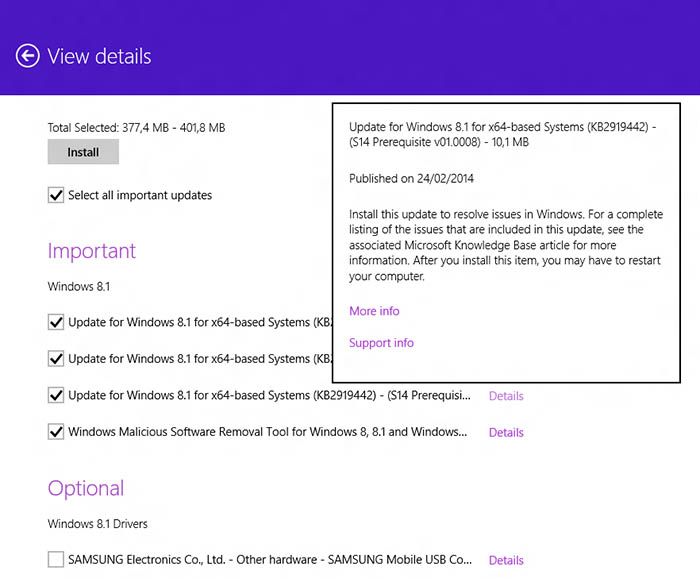 Et voilà, Windows Update fera apparaître 2 mises à jour, des pré-requis, à installer puis redémarrez votre ordinateur. Ensuite, d’autre mises à jour s’afficheront sous le nom de “Update for Windows 8.1 for x64-based Systems (KB2919442) – (S14 Prerequisite v01.0008)”.