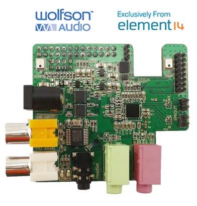 Mais désormais c’est du passé, puisque maintenant vous pouvez vous procurer la nouvelle carte audio Wolfson de Element14, qui n’est autre que l’un des fabricants du Raspberry Pi. Il s’agit d’une carte audio intégrée dédiée au petit ordinateur, ajoutant le support pour la lecture et l’enregistrement audio en haute qualité.
