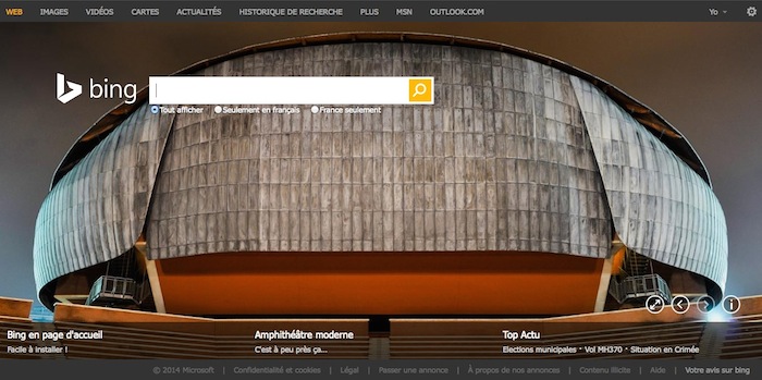 Bing a aussi ses points forts. C’est un produit de Microsoft qui fournit son algorithme au moteur de recherche Yahoo! Search, et qui est intégré à Hotmail, Facebook, et Siri. Alors que Google peut vous donner tout ce dont vous avez besoin pour trouver ce que vous cherchez, il est difficile de ne pas regarder Bing. Il comporte des magnifiques images qui changent fréquemment l’arrière-plan sur l’écran d’accueil et affiche de petites images en bas avec les titres des tendances actuelles.