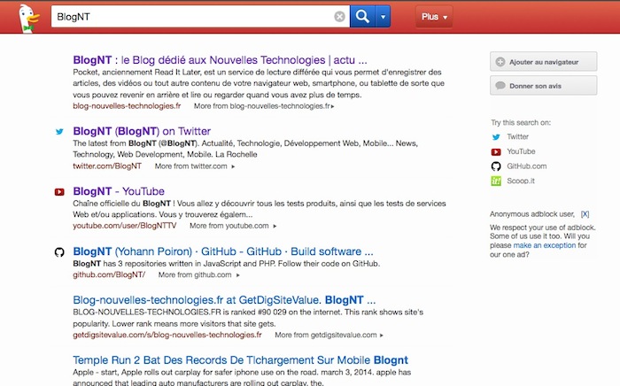 DuckDuckGo n’est certainement pas aussi connecté que Google, et pas être aussi flashy que Bing, mais il y a une chose que DuckDuckGo propose qui est très intéressant, et c’est l’anonymat. C’est quelque chose qui est parfois important, et que nous perdons avec Google et Bing. Chaque produit de Google sait ce que vous avez fait sur l’ensemble de ses autres produits. Parfois, nous voulons simplement chercher sans que le moteur de recherche nous “suive”. Cependant, en passant à un mode 100% anonyme, il faut savoir que les résultats ne sont pas adaptés spécialement pour vous. Tout le monde dispose des mêmes résultats de recherche.