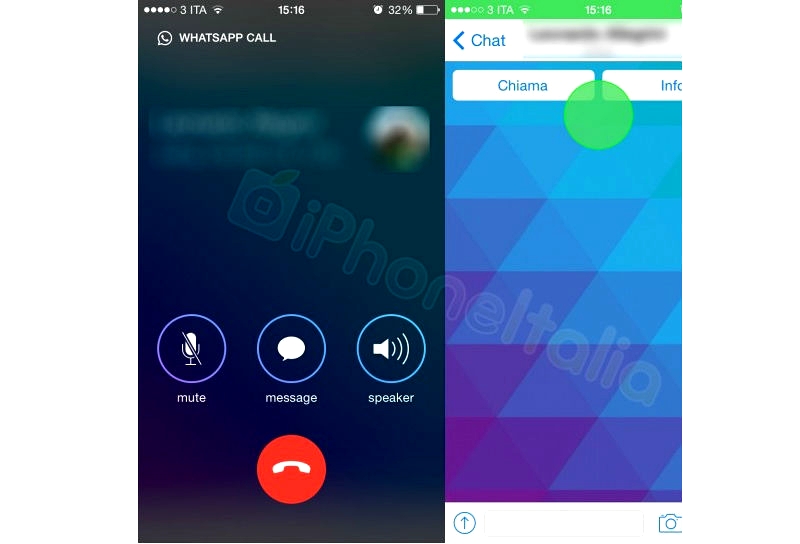 Si l’on en croit les images affichées ci-dessous, les appels sur WhatsApp vont ressembler à ceci sur iOS 7. Les images proviennent du blog iPhoneItalia, venant soi-disant d’une version bêta de la nouvelle option de voix sur IP de WhatsApp.