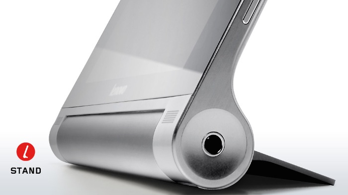 Je pourrais dire beaucoup au sujet de la conception de la tablette Yoga, mais il n’y a qu’une seule chose qui la distingue de ses concurrentes, et c’est le grand cylindre sur le côté (ou en bas, selon la façon dont vous tenez votre tablette) et la béquille en aluminium qui se replie.