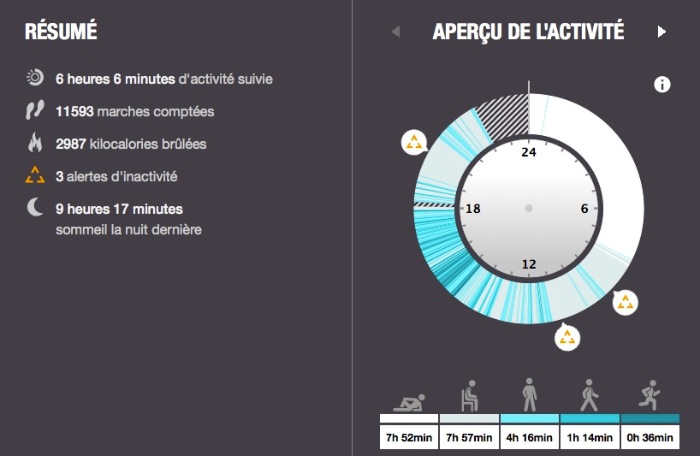 L’application classe les activités en cinq niveaux, allant du repos (sommeil et repos, en position allongée) à élevé (jogging, course à pied et autres activités intenses). En dessous du cercle, un petit tableau montre combien de temps vous avez passé dans chacune de ces catégories. En dessous, une barre affiche la distance que vous avez passé en vue d’atteindre les objectifs de la journée. Faites défiler la liste, et vous pouvez voir un résumé des calories brûlées, les différentes mesures, de votre sommeil et du temps actif, ainsi que les alertes d’inactivité.