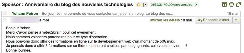 Une fois les idées en tête, j’ai envie de dire qu’il ne “reste” plus qu’à circuit cibler des entreprises et envoyer vos mails… Personnellement j’ai voulu dans un premier temps alerter des entreprises locales, c’est-à-dire présentes aux alentours de La Rochelle. Malheureusement je n’ai eu que des réponses négatives voire même pas de réponse. Bien dommage au vue de la fréquentation de chaque article ainsi que des participations, il aurait été intéressant de les faire connaître… Bref ! Du coup j’ai commencé à faire mes recherches sur le Web. Attention ne croyez pas que ce soit tout rose ! Pas facile de convaincre des entreprises, des maisons d’éditions, etc… Deux jours après ma première campagne de mails, j’ai reçu une première réponse positive de la part de video2brain ! Cela à été mon coup de boost ! Merci 😉