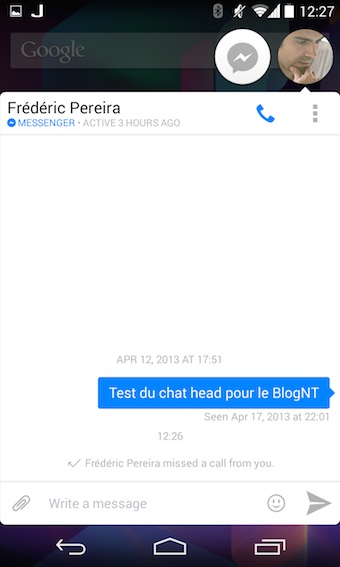 Quoi qu’il en soit, l’ajout le plus intéressant pour Facebook Messenger 4.0 est le support des appels gratuits. Comme vous pouvez le voir dans les captures d’écran ci-dessous un téléphone bleu est apparu dans le coin supérieur droit d’une fenêtre de chat qui peut être utilisée pour appeler le contact à qui vous parlez.