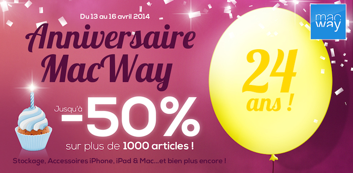 C’est donc pour son anniversaire débutant aujourd’hui que la boutique a décidé de récompenser ses fidèles acheteurs, ainsi que les nouveaux venus avec jusqu’à -50 % sur plus de 1000 produits, de quoi faire ou se faire plaisir, et ce dans tous les univers MacWay : enceintes, disques durs, mémoires et les accessoires pour Mac/iPhone/iPad/iPod. L’opération qui a débuté ce jour, le 13 avril, se terminera le 16 avril prochain.