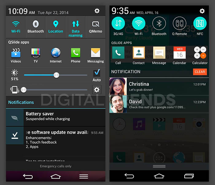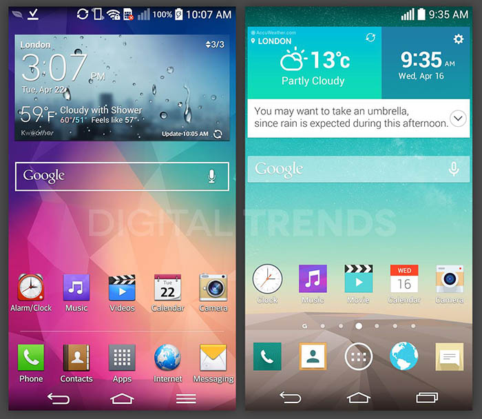En effet, comme vous pouvez le voir dans les images dévoilées par Digital Trends, celle-ci arrive avec un nouveau look, la rendant beaucoup plus lumineuse, aplatissant les icônes et un écran plus propre en ce qui concerne les notifications. Si vous considérez que le nouveau look est une amélioration ou non, est sans doute une question d’opinion, celle-ci revient un peu plus en phase avec KitKat, et qu’il est également difficile de nier qu’il y a au moins quelques similitudes entre la UI du LG G3 et iOS 7.