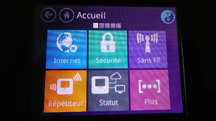 L’interface utilisateur est intuitive, et accessible depuis la dalle tactile ou encore un mini stylet fourni. Elle nous fournit la possibilité de nous rendre dans l’administration Web, les mises à jour logiciels, les types de sécurité, le journal de connexion, les statistiques d’utilisation, les filtres de pare-feu et autres paramétrages.
