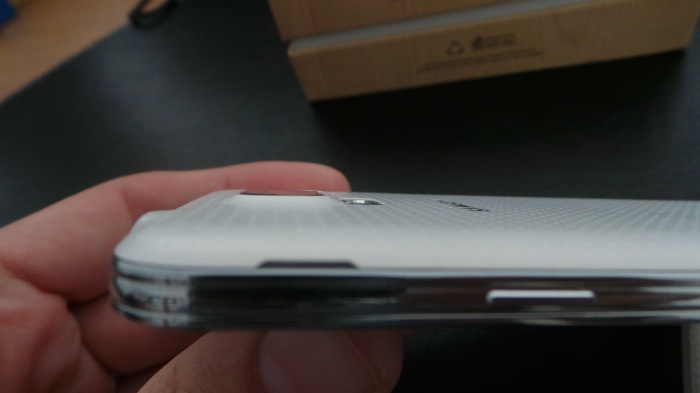 L’arrière du téléphone mérite une attention toute particulière. Alors que nous aurions pu penser que Samsung continuerait avec un aspect faux-cuir (une tendance de couture que nous avons découverte avec le Galaxy Note 3), ce n’est clairement pas le cas sur le Galaxy S5. Au lieu de cela, nous avons à faire à une coque qui présente des micro-aspérités, qui n’est pas sans rappeler la tablette Nexus 7 2012 d’ASUS.