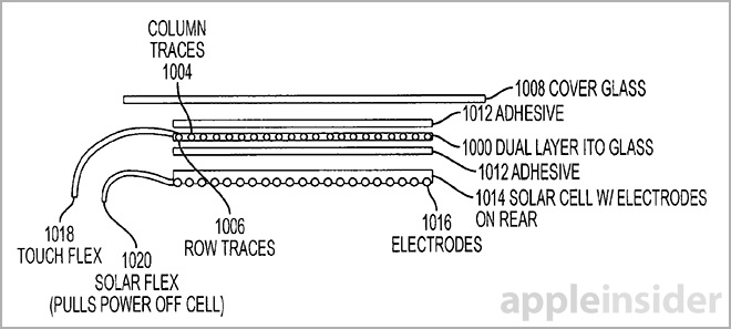Le nouveau brevet comprend une ou plusieurs couches de capteurs tactiles et une ou plusieurs couches de cellules solaires. Cette intégration en pile est destinée à réduire la zone de surface du dispositif. Selon le brevet, cette configuration permettrait à la lumière d’arriver plus efficacement sur les panneaux solaires.