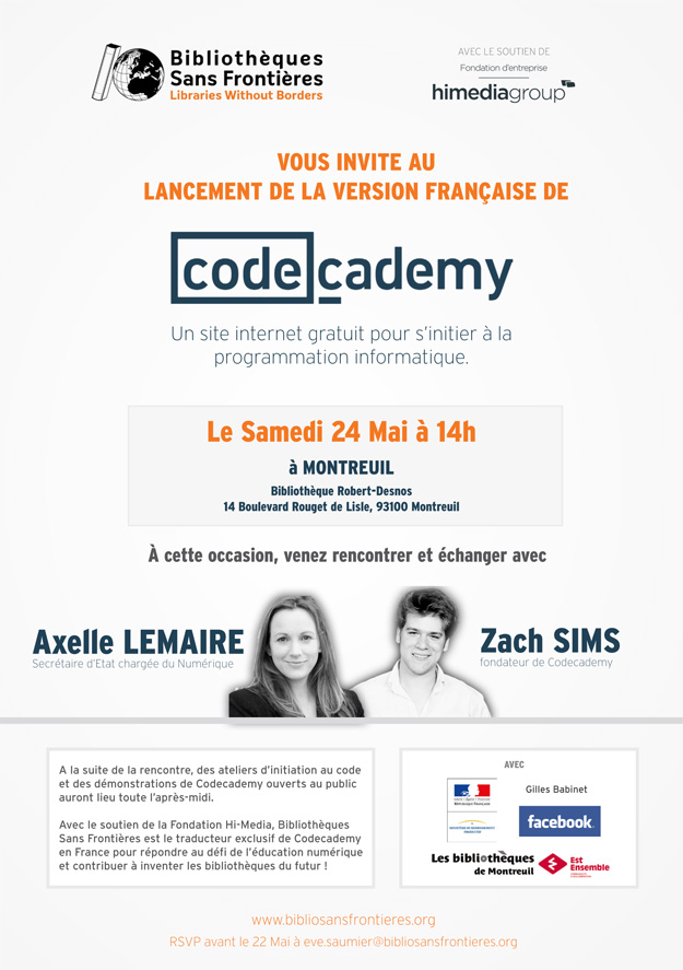 D’ailleurs, et à ce sujet, à l’occasion du “lancement en France” du site internet gratuit pour s’initier à la programmation informatique, le samedi 24 mai à 14h à Montreuil vous aurez l’occasion de rencontrer et discuter avec Zach Sims et Axelle Lemaire, la Secrétaire d’État chargée du Numérique.