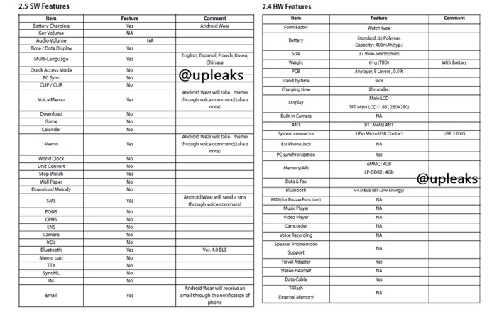Mais, ce n’était sans compter sur Internet, qui une nouvelle fois à révéler toute sa puissance. En effet, un graphique affiché par @upleaks sur Twitter révèle ce qui semble être les spécifications réelles de la G Watch. Parmi celles-ci, on apprend notamment que la montre embarquera un écran de 1,6 pouces avec une résolution de 280 × 280 pixels, 4 Go de stockage interne, et une batterie de 400 mAh qui offrira une autonomie de 36 heures et prendra 2 heures pour une recharge complète.