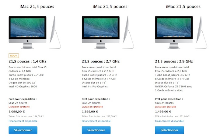 La nouvelle version commercialisée 1099 euros comprend un écran de 21,5 pouces offrant une résolution 1080p, un processeur double-cœurs Intel Core i5 cadencé à 1.4 GHz et un mode Turbo Boost augmentant la fréquence à 2,7 GHz, 8 Go de mémoire vive, un disque dur mécanique de 500 Go à 5400 rpm, et une puce graphique Intel HD Graphics 5000. Basé sur ce document d’Intel, l’hypothèse est que le processeur exact utilisé ici est le processeur Intel Core i5-4260U, qui correspond au Turbo Boost trouvé dans ce nouvel iMac, ainsi que son processeur graphique intégré Intel. Le i5-4260U a été lancé au cours du deuxième trimestre de cette année.
