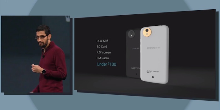 Google a dévoilé un exemple de smartphone Android One produit par Micromax. Le smartphone double-SIM dispose d’un écran de 4,5 pouces et d’une radio FM intégrée. Le dispositif sera vendu à moins de 100 dollars. Le Micromax sera lancé avec deux autres appareils, Karbon et Spice, le tout conçu pour fournir des smartphones abordables à des marchés encore inexploités.