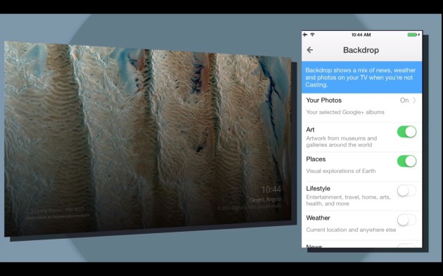 En présentant “Backdrop”, cette nouvelle fonctionnalité est disponible depuis les paramètres à l’aide d’un dispositif iOS ou Android, et fonctionnera avec Google Now vous permettant de simplement demander à votre smartphone “ce qui est sur mon Chromecast” pour recevoir plus d’informations sur les images sur votre téléviseur.