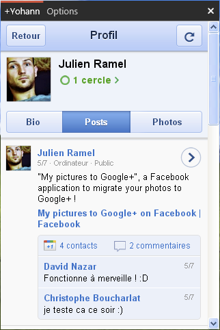 Le client est pleinement fonctionnel, vous pouvez donc consulter les profils des autres, voir les cercles que vous avez créés et enfin ajouter de nouveaux contacts à vos cercles.