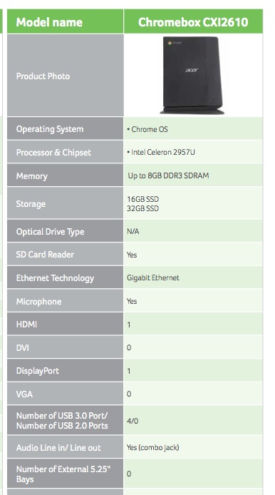 Alors qu’il y a quelques minutes je vous ai relayé le fait qu’une brochure en ligne révélait les divers périphériques que Acer a prévu de commercialiser pour l’année 2014, celle-ci a fait notamment apparaître le CB5 et le C730, qui sont deux Chromebooks, l’un avec une puce Bay Trail et l’autre avec une puce NVIDIA Tegra, le Chromebox CXI2610 faisait également parti de cette liste, avec une annonce attendue pour la seconde moitié de l’année 2014.