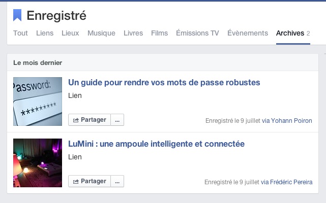 Le bouton Enregistrer met tout le contenu que vous souhaitez enregistrer dans un dossier “intelligent” sous l’onglet “Plus” de l’application mobile, ou dans la barre latérale de gauche du site. De là, vous serez en mesure de parcourir les différents articles que vous avez enregistrés, et ainsi vous plonger dans l’article ou la page de votre choix. Les articles sauvegardés sont classés par catégorie, donc si vous avez enregistré un tas de pages de musique, elles vont très certainement être toutes regroupées dans une section pré-définie, tandis que les liens de vos amis apparaîtront dans une autre section.