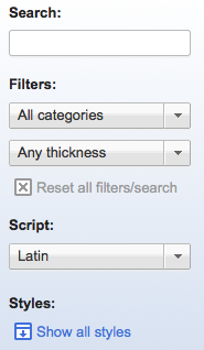 Il y a aussi une fonction de recherche que vous pouvez utiliser pour rechercher votre police préférée dans le référentiel des polices de Google. En dessous de la case de recherche il y a différents filtres qui vous permettent de restreindre la recherche de la police de votre choix.