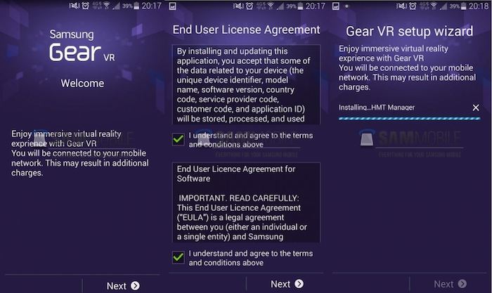 Comme le souligne SamMobile, lorsque l’utilisateur lance l’assistant de configuration de l’application Gear VR, ils sont accueillis avec un écran de bienvenue. Après la procédure d’initialisation, ils sont tenus d’accepter un contrat de licence utilisateur, après quoi l’assistant d’installation démarre avec le téléchargement de toutes les applications de base depuis les serveurs de Samsung, comprenant notamment : VR Panorama, VR Cinema et HMT Manager (Early Gear VR Manager).