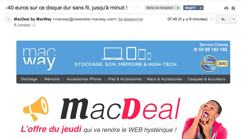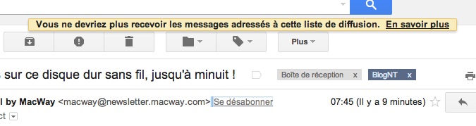 Voilà comment cela fonctionne. Chaque fois que vous recevez un e-mail dans votre boîte de réception Gmail qui contient un lien de désabonnement, Google va le récupérer, et tout simplement mettre le chemin complet vers celui-ci tout en haut du message à la droite de l’adresse mail de l’expéditeur. Cela va tout simplement faciliter le fait de le trouver.