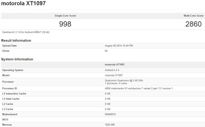 Selon les résultats Geekbench, le prétendu Motorola XT1097 est alimenté par un processeur quadricoeurs Snapdragon MSM8974 qui appartient à la famille des Snapdragon 800. Toutefois, le dispositif est cadencé à 2.46 GHz, de sorte que celui-ci pourrait être le dernier processeur Snapdragon 801.