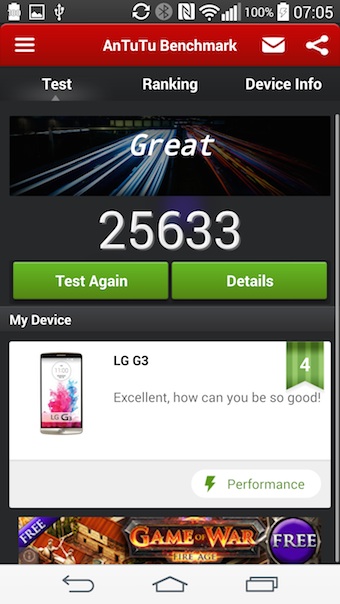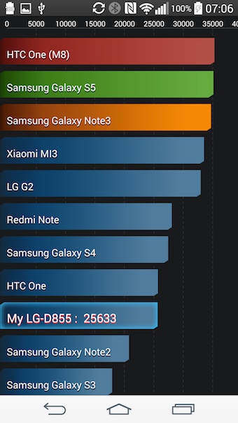Durant celle-ci, la connexion Bluetooth à une Pebble était activée, le hotspot Wi-Fi a été un peu utilisé, tout en couplant le mélange habituel de mails, SMS, jeux, ainsi que divers appels. Cette excellente performance est rendue possible par un logiciel de LG qui apporte des ajustements à la fréquence d’images, à l’utilisation du processeur afin de maximiser la durée de vie de la batterie. Tout cela est fait en arrière plan, et LG a promis que le smartphone offrirait une autonomie similaire à un téléphone en 1080p.