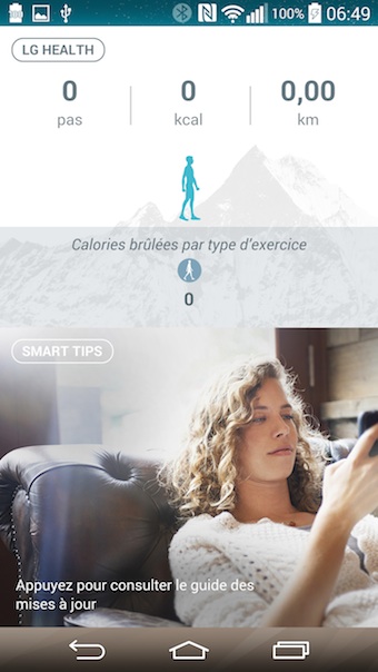 Smart Tips et LG Health apparaissent toutes les deux sur l’écran d’accueil. En lançant Smart Tips, vous obtiendrez des conseils sur la façon de tirer le meilleur parti des fonctionnalités du G3. LG Health fonctionne comme un traqueur de remise en forme. Elle compte vos pas, peut enregistrer des entraînements spécifiques, et assurer le suivi des calories brûlées. En saisissant vos propres stats, elle recommande la durée de sport que vous devez faire chaque jour pour perdre du poids.